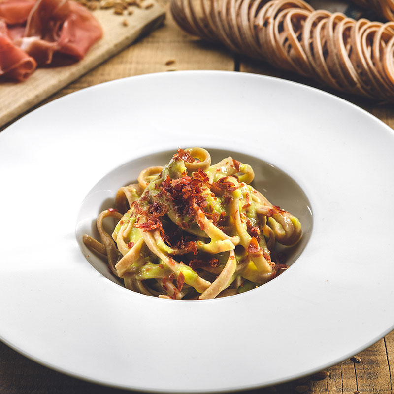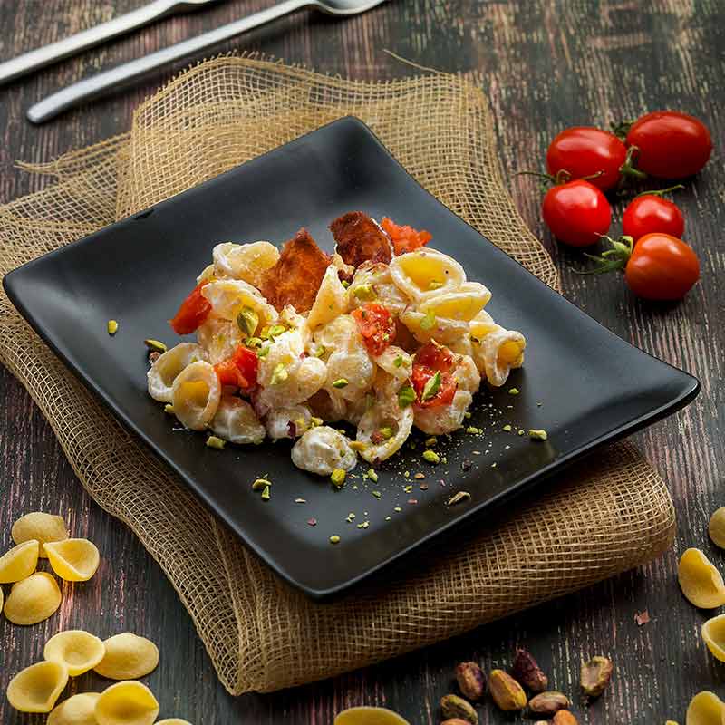 Orecchiette con crema di ricotta, guanciale e pistacchio