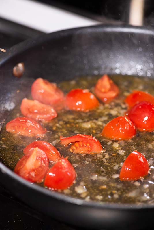 Porre sul fuoco una padella con un filo d'olio extra vergine, aggiungere lo scalogno e lasciarlo dorare. Quando sarà pronto, aggiungere i pomodorini, un pizzico di sale e lasciar cuocere a fiamma vivace per qualche minuto. Nel frattempo, in una casseruola, portare a bollore dell'acqua leggermente salata, aggiungere le rondelle di asparagi e solo dopo un minuto scolarli e passarli in una boule con acqua e ghiaccio. In questo modo la verdurà resterà verde e croccante. Scolare e ripetere l'operazione con le punte di asparagi.