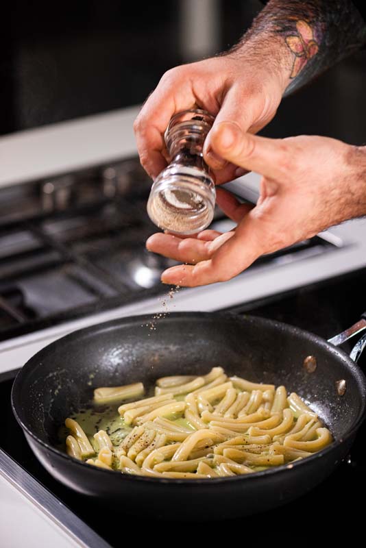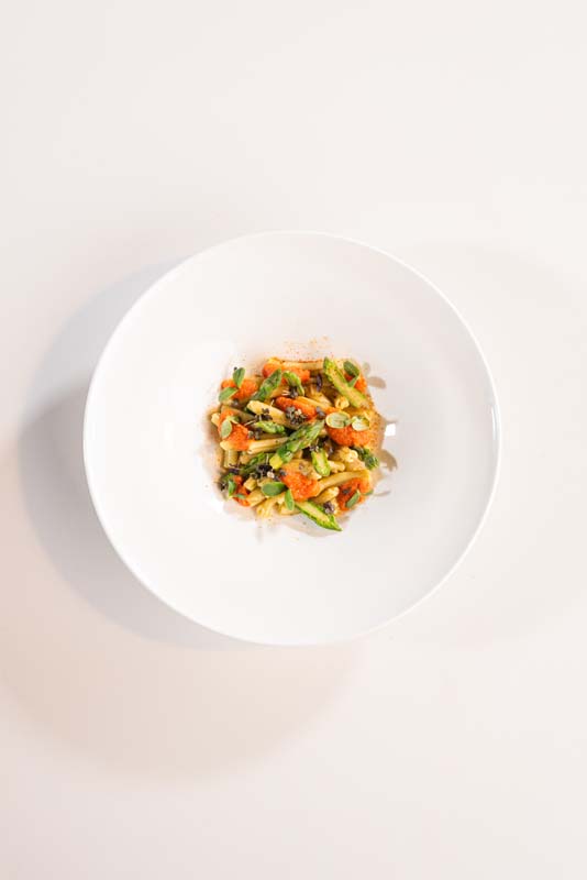 Nella stessa padella in cui sono stati saltati i pomodorini, lasciar restringere la salsa di asparagi. Buttare la pasta e scolarla al dente, versarla nella padella con la salsa di asparagi e mantecare per bene. Impiattare aggiungendo le punte degli asparagi ripassati velocemente in padella e tagliati a metà ed il pesto di pomodorini.