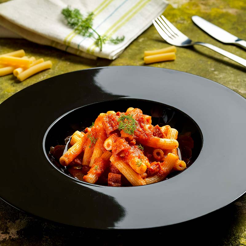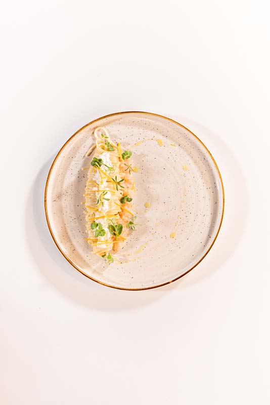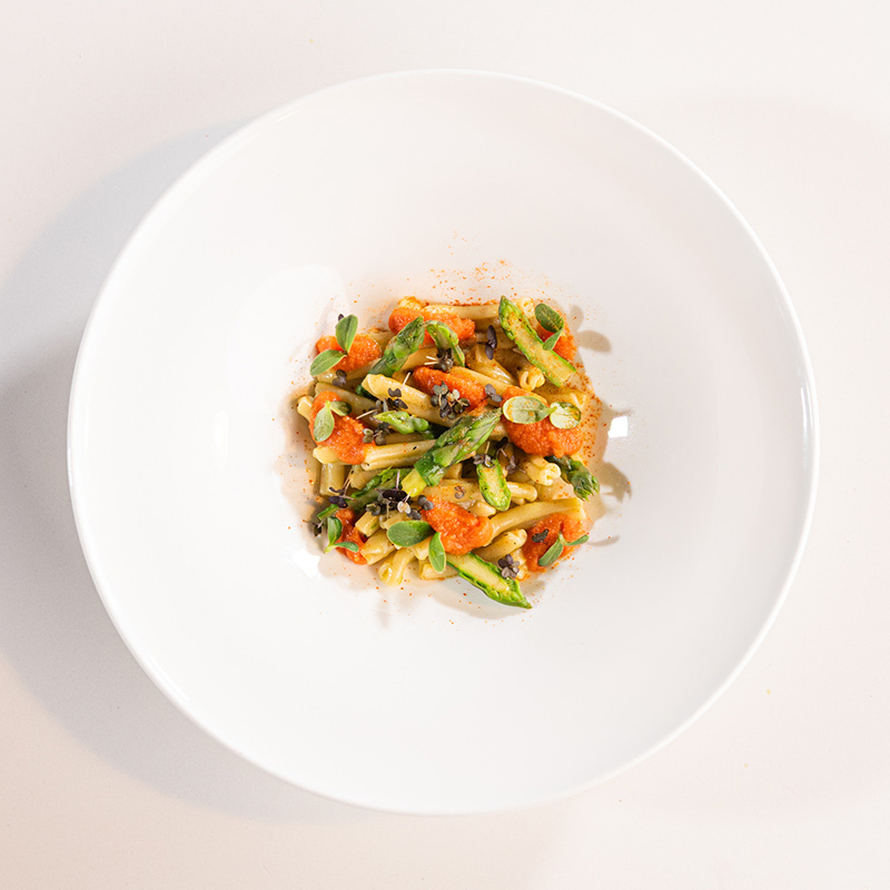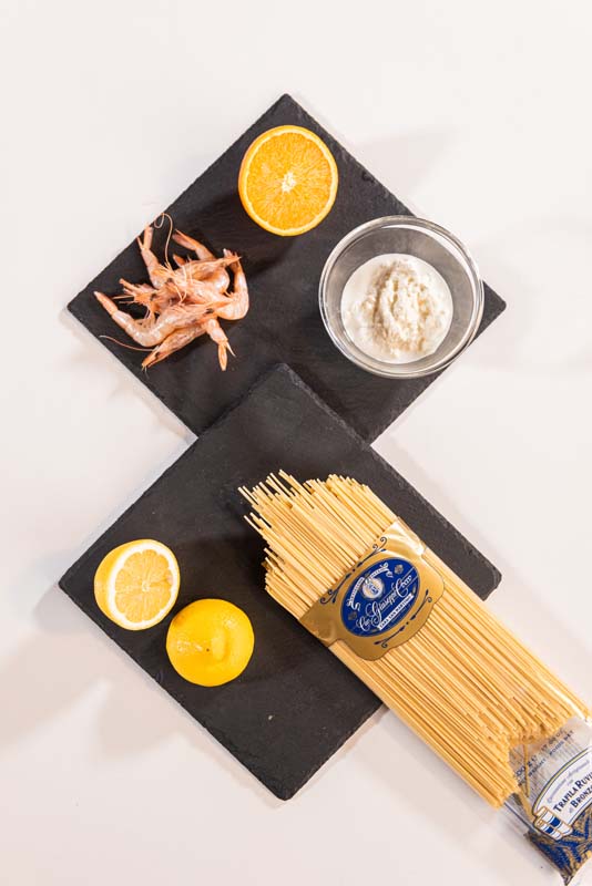 Impiattare la pasta aggiungendo la restante crema di burrata e la tartare di gamberi rosa.