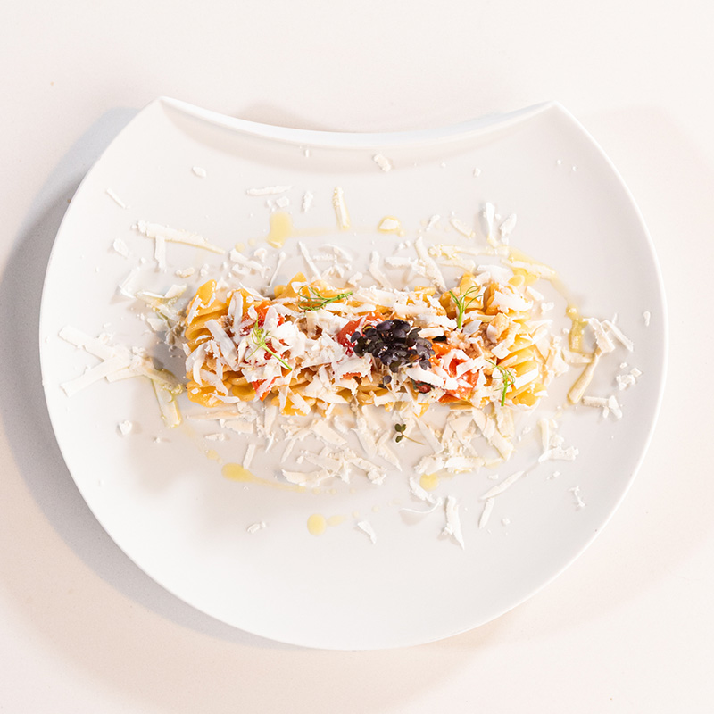 Scolare al dente le linguine e saltarle nella padella della bisque in cui aggiungere un cucchiaio di crema di burrata, un goccio d'olio, un pizzico di pepe ed una leggera grattugiata di buccia di limone.
