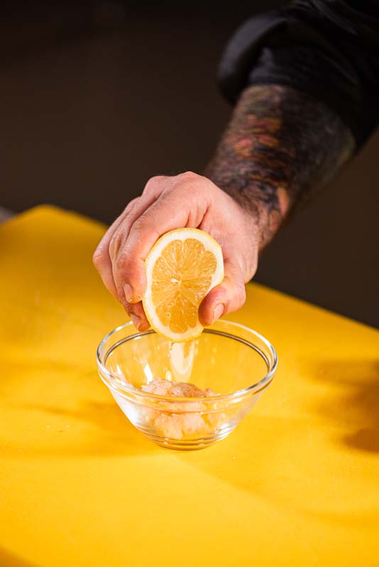 Pulire per bene i gamberi rosa privandoli della testa e del budello. Lavare gli agrumi, tagliare con un pelapatate la buccia facendo attenzione a non prendere la parte bianca. In una padella con un filo d'olio, saltare le teste dei gamberi e la scorza degli agrumi, aggiungere del ghiaccio a cubetti e attendere che si formi una deliziosa bisque. Salare e pepare.