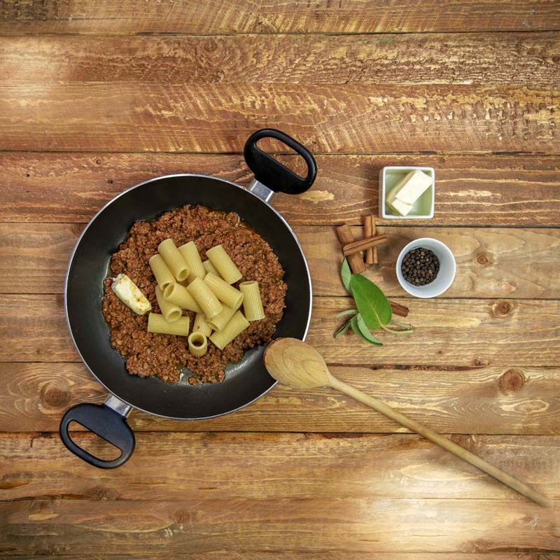 Il ragù alla bolognese ha origini aristocratiche: piatto ricco e costoso, compariva un tempo unicamente su tavole altolocate e solo in un secondo momento venne abbinato alla pasta. I rigatoni, abili pescatori di sugo sia al loro interno che all’esterno, sanno come catturare in quantità generose il nobile condimento, uno dei più famosi ambasciatori della cucina italiana nel mondo.