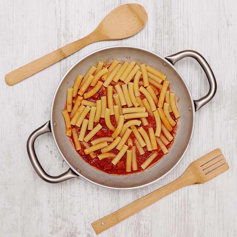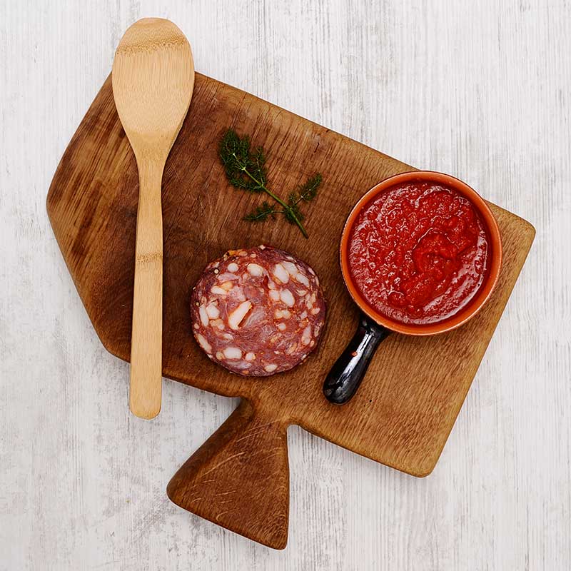 La ventricina è il salume abruzzese più tipico. E’ definito un salume nobile perché composto dalle parti più pregiate del maiale. La carne, rigorosamente tagliata al coltello, viene impastata con sale e peperone rosso tritato. Quest’ultimo è l’ingrediente che conferisce alla ventricina il suo caratteristico sapore. Con questo pregiato salume prepariamo un saporito ragù da gustare con i nostri sedani rigati.